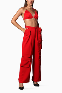 Featuring Strappy Bikini Top With Cargos Pants by Swatee Singh. Unleash style in vibrant red heavy crepe. This set has a relaxed fit, is the epitome of casual chic.