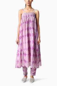 Command the spotlight in the Strappy Plum Co-ord Set, featuring a sleek strappy sun dress paired with tailored pencil pants. Crafted in rich purple Dabu hand-block printed Chanderi silk, printed in Bagru near Jaipur, this ensemble blends bold sophistication with artisanal heritage.