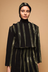 Featuring the Strata Jacket, a black cropped piece crafted from blended viscose. It is embellished with vertical hand-embroidered Monet green stripes, offering a relaxed fit with a structured high neck and full sleeves. Designed to pair perfectly with the Monet green skirt for a coordinated look.