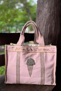 A delicious duo of ice-cream tantalizes. In Strawberry Pinks and Icy Blues, Artchives’ Ice-cream mania tote comes to life encrusted with the finest sparkling crystals. Hand embroidered in crystals, sequin, kasab and aari on pure Cotton Canvas with pure cotton printed lining. The Tote has one main large pocket with a zip and two smaller side pockets with zips and a crossbody strap. Imperfections of hand embroidery represent the natural beauty & rawness of handicrafts in our products. While firmly encrusted, we do not take any guarantee of the crystals falling.