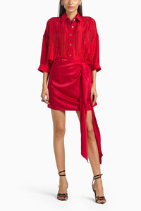 The Streamlined Shirt, hand embroidered with delicate details, the strings on the shoulder are fun, flirty and give just the right amount of bling. Crafted in silk, it brings life to whatever you pair it with. For a sleek day-to-night look, style the shirt with a high-waisted midi skirt and metallic clutch bag.
