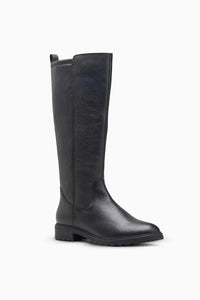 These black long stretch boots are crafted from soft leather and four-way stretch material, ensuring a perfectly snug fit on your calf. Designed for both comfort and style, they adapt to your shape for a sleek, tailored look.