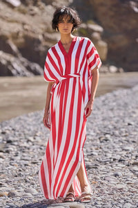 Red and white bold striped kaftan dress in maxi length. V-neck with a tie-up belt at the waist for a flattering silhouette. Drop shoulder kaftan sleeves. Side slits and soft ruching at the back for added shape. Comes with a slip.
