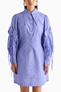 Featuring the Stripe Shirt Dress by MellowDrama's Utopia Collection. Made from 100% cotton, this mini shirt dress features a front opening with buttons, sleeves adorned with handcrafted 3D leaf and crystal details, a statement collar, wide cuffs, curved bottom hem, and a regular fit for a sophisticated yet relaxed style.