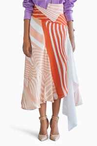 Featuring stripes skirt in peach and tangerine running unguided on a white base. The hem line is asymmetrical with scarf fold waist band. The left leg has a button down which could be left open or shut as on wearers discretion. Zip fastening and full lining.