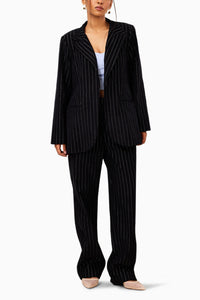 This corduroy pant suit features a relaxed-fit blazer with subtle vertical stripes and matching wide leg trousers