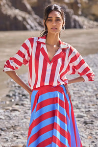 Make a statement with this dramatic red and white striped shirt, crafted in a fluid satin that drapes effortlessly. Featuring a button-down front and a relaxed fit, the design is enhanced with side slits for ease and movement. Full sleeves with buttoned cuffs and a classic shirt collar complete the look—perfect for elevating everyday style with bold elegance.