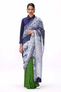 A handwoven striped silk saree with contrast pleats. The pallav and body of the saree is dyed in navy using the traditional technique of Arashi Shibori. The saree is handwoven on a traditional loom and is designed to move from green in the pleats to a striped body while weaving. It comes with an unstitched green silk blouse piece.