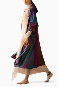 Handwoven Yarn Dyed Silk/Cotton Trench With A Contrast Printed Lining And Fabric Manipulated Tassel Details.