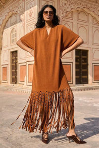 Kaftan dress crafted from rich, luxurious suede finish fabric. V-neckline. Hand-cut fringes at the hem with thoughtfully placed hand-applied rivets.