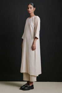 The Sufi Set from Mo by Meet features a minimalist off-white silhouette crafted from handwoven cotton. With clean lines and delicate detailing, it combines modern elegance with artisanal craftsmanship