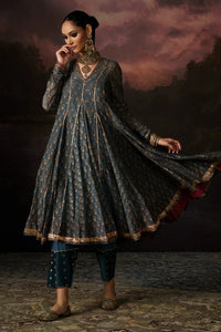 Featuring Sufia Teal Kurta by Swatti Kapoor’s Firdaus collection. This handwoven 40gm Chanderi kurta showcases hand block prints, choori sleeves, delicate embroidery, and gota detailing, elegantly paired with a 100% cotton slip for comfortable sophistication.
