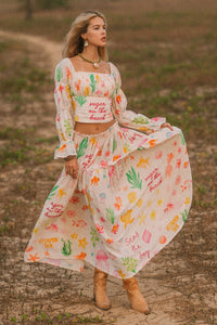 A high-waisted maxi skirt crafted in Printed Linen featuring the signature Sugar On The Beach print. Designed with a flowy silhouette and elasticated waistband, the lightweight fabric offers effortless movement and comfort, ideal for relaxed resort and summer styling.