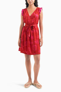 The Sugar SPF Dress is a sleeveless V-neck dress designed for easy elegance and comfort. Featuring a self-tie belt that allows for a customizable fit and adorned with a unique in-house print, this dress is perfect for sunny days and effortless style.