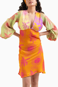 The Sugar Sun Dress is a stunning deep V-neck dress with contrast-colored long puff sleeves, adding a touch of drama and elegance. Adorned with a signature in-house print, this dress combines bold style with feminine charm, making it perfect for both casual and dressier occasions.
