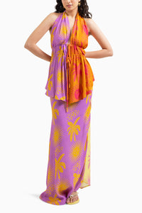 The Sugar Sun Top paired with the Sugar Sun Skirt creates a beautifully coordinated look. The halter neck top, with its front tie-up detail at the waist and signature in-house print, exudes a playful and chic vibe. Paired with the straight, full-length skirt that offers a fitted silhouette and the same in-house print, this ensemble provides an elegant yet effortless style, perfect for both casual outings and more dressed-up occasions.