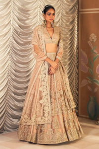 Elegantly timeless, the Sukhan Lehenga Set includes a champagne net embroidered blouse and matching lehenga, finished with a delicate net dupatta. An ethereal ensemble, ideal for weddings, receptions, or grand festive evenings.