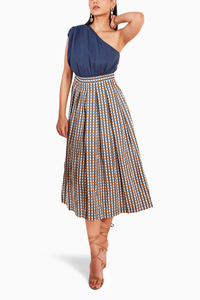 Dive into the spirit of summer with this one-shoulder midi, a playful blend of bold hues and modern design. The circle print is the perfect way to add a touch of whimsy to your warm-weather wardrobe.