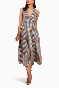 Featuring our Summer Circle print, this halter midi dress is elevated with gold detailing and ruching that flatters all body types. Consider this a must-have for your warm-weather wardrobe.