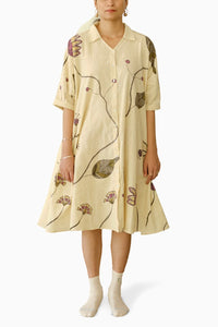 Discover our beloved panelled shirt dress, adorned with unique placement prints for an effortlessly beautiful look. With an oversized fit and practical side pockets, this dress combines style with function. Crafted from 100% cotton, and hand-painted with Kassim, Lac, Myrobalan, and Green Lake dyes, it showcases a perfect blend of artisanal craftsmanship and everyday comfort.