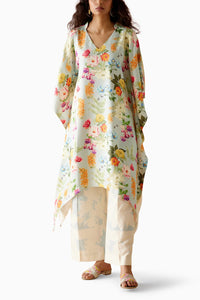 Fabric- Bemberg Twill Cotton Satin, Pure Linen Colour- Multicolor, White, Floral Fit- Loose Fit Components- 2 Product code- SVEMOHKSS2357