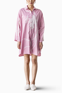 Featuring a pale pink floral lino print mul shirt dress with front button opening and a folded sleeve hem.