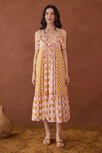 Crafted from lightweight, breathable cotton mul-mul fabric, the silhouette flows like dappled sunlight through leaves, making it an essential wardrobe staple for the season. This dress features a wide v neckline adorned with a contrasting frill and noodle strap. The skirt area is a easy A line shape with multiple panels and a side zip closure.The delicate soft gingham checks lend an artisanal touch, mirroring the gentle textures found in nature’s canvas.