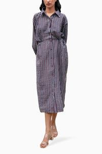 Reminisce about an afternoon siesta spent lazing on the grass with our Sunday brunch dress crafted in striped chanderi silk fabric. It, a collared button-down shirt dress adorned with handcrafted buttons. It has classic drop shoulder bishop sleeves, side slits and comes with a tie-up which can be tied at the back for the perfect fit & look. It also comes with functional side pockets.