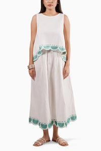 Twirl under the stars with our enchanting white Sundowner Co-ord Set, inspired by the rumbling waves near the seashore. Embrace the irresistible comfort of soft linen against your skin, making this a remarkable addition to your wardrobe.Featuring a unique honeycomb neck design and beautifully embroidered borders, this set combines elegance with a relaxed vibe.