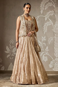 The Sunehri Lehenga Set radiates understated grandeur, featuring a delicately embroidered tissue blouse and a flowing plain tissue lehenga. Paired with an exquisitely embroidered sleeveless jacket, this ensemble blends minimalism with regal flair- an ethereal statement in modern couture, designed for the muse who speaks in quiet luxury.