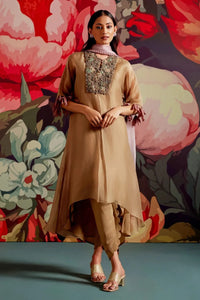The Sunela Kurta Set from Parul & Preyanka’s Parizaad collection is an olive gold silk organza ensemble with a kaftan, tulip pants, slip, and dupatta. Adorned with intricate floral Dori and Zardozi embroidery, it’s perfect for weddings and festive celebrations.