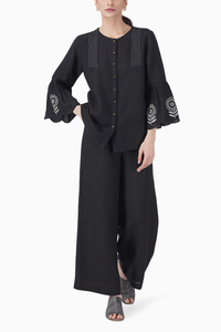 Introducing our sunflower embroidered pin tuck top paired with high-waist flare pants, meticulously crafted in 100% linen for a chic and timeless look.