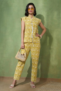 A vibrant yellow co-ord set featuring a charming eyelet pattern. It includes a stylish cap-sleeved top with a lace-up front and matching tailored pants, perfect for a sunny and elegant look.