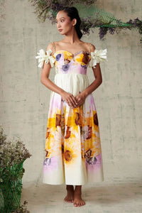 The Sunflower Placement Off-Shoulder Dress is a stunning and summery garment that exudes effortless charm and style. Featuring carefully arranged sunflower prints, this dress showcases a delicate balance of elegance and playfulness. The off-shoulder neckline adds a touch of romance, while the placement of sunflowers creates a visually striking effect. Perfect for warm-weather occasions, garden parties, or a day out in the sun, this dress radiates cheerful vibes and captures the essence of summer.