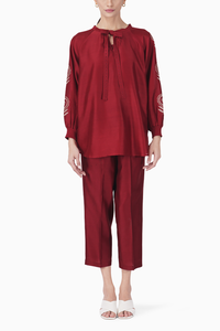 Featuring a sunflower sleeve embroidered top with straight pants, tailored in silk chanderi.