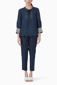 Featuring a sunflower sleeve embroidered top with straight pants, tailored in 100% linen.