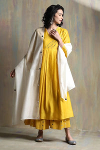A Chanderi kurta featuring mirror-embellished bell sleeves and intricate mirror work on the yoke. This kurta set is paired with a Chanderi dupatta adorned with mirrors on the border and cotton palazzos, embellished with mirrors, offering a blend of traditional elegance and modern sophistication.