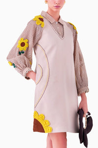 Capture the essence of summer with our Sun-Kissed Ecru Banana Crepe Dress. This A-line short dress features a lightweight banana crepe fabric and a charming layer of nylon and cotton dobby. Adorned with hand-embroidered sunflower appliqués, side pockets, and elegant beadwork along the stitch lines, it’s the perfect blend of comfort and style. Ideal for sunny days and special occasions alike!