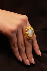 This lovely 22kt gold plated ring is a modern rendition of classic oval shaped gemstone jewellery. A luminous oval shaped pearl is framed with a 22kt gold plated textured edge which works as a beautiful contrast. Refined, polished and extremely wearable, the ring is timeless and a perfect day to night wear. A great option to ace your accessorising game and travel style. Finish the look with matching stud earrings or brooch from the collection.