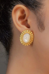 These 22kt gold plated earrings are a modern rendition of classic oval shaped stud earrings. A luminous oval shaped pearl is framed with a 22kt gold plated textured edge which works as a beautiful contrast. Refined, polished and extremely wearable, the earrings are timeless and the perfect day to night wear. A perfect pair to ace your accessorising game and travel style. Finish the look with matching ring or brooch from the collection.
