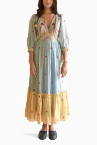 Discover our sumptuous Sunny Sky dress in the eye-soothing hue of sky blue and pale yellow. A combination of stripes & floral print has been used in the dress to add more drama to it. Fall for its feminine silhouette which is further enhanced by hand embroidery details on the bodice. It features a V-neckline and three-quarter tie-up sleeves. It also has an alluring deep square back and a tier at the bottom. Fitted at its waist and flared at the bottom, this Chanderi silk dress is perfect for a summer day outing.