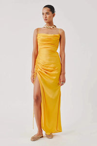 Featuring the Sunny Yellow Spaghetti Draped Dress from Aroka's Signature Collection, a rich modal satin bodycon dress sculpted to contour and flatter. The draped cowl neckline adds a soft, romantic touch, while the adjustable drawstring slit offers customizable movement and allure. Finished with slim adjustable straps, a side zip closure, and voile lining for ultimate comfort and ease.