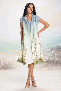A relaxed-fit collared jacket paired with a fitted round-neck inner dress, featuring extended sleeves adorned with landscape-inspired cotton embroidery, along with delicate handmade crochet flowers and leaves. The design combines dip-dye, hand-screen printing techniques, and intricate hand-embroidered cotton details, creating a unique blend of artistry and elegance that enhances the overall look.