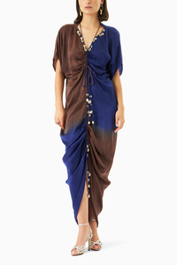 Sunset Blues, is our Semi Fit Kaftan featuring dropped shoulder sleeves and adjustable string that creates gather all through neck till thighs. This effortless sillhoute is a perfect relaxed evening outing. Kaftan has been embellished with shells through neckline and as knot hangings. It drops till ankle, giving it a relaxed sensual look.