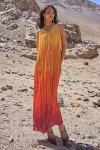 A striking hand-crushed maxi dress featuring a mesmerizing ombré print that fades from rich rust to warm mustard, evoking the hues of a sunset. Designed with a flattering V-neckline and a free-flowing silhouette, this dress combines ease with elegance—perfect for effortless day-to-evening transitions.