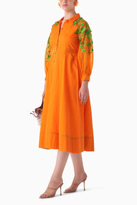The Mimosa sunset orange midi dress in cotton twill features contrast thread embroidery on sheer organza sleeves, adorned with delicate 3D hanging leaves. Designed with a button-down front, side pockets, and a back elasticated waist, it offers a flattering fit-and-flare silhouette with artistic charm.