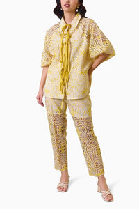 Embrace effortless elegance with the Sunlit Lace Elegance Blouse, a perfect blend of sophistication and charm. This delicate, semi-sheer lace blouse features an intricate floral cut-out design layered over a soft yellow fabric, exuding a vintage-inspired aesthetic with a modern twist. The structured collar and front tie ribbons add a touch of femininity, while the relaxed fit and three-quarter puff sleeves ensure comfort and versatility. Ideal for brunch dates, garden parties, or chic casual outings, this blouse pairs beautifully with tailored pants or denim for a timeless, graceful look.