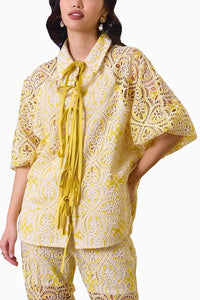 Embrace effortless elegance with the Sunlit Lace Elegance Blouse, a perfect blend of sophistication and charm. This delicate, semi-sheer lace blouse features an intricate floral cut-out design layered over a soft yellow fabric, exuding a vintage-inspired aesthetic with a modern twist. The structured collar and front tie ribbons add a touch of femininity, while the relaxed fit and three-quarter puff sleeves ensure comfort and versatility.