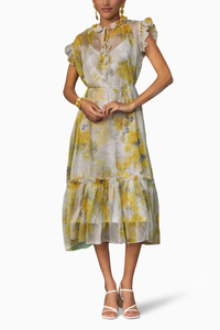 This breezy dress is a everyday favourite. Lace detailing on neck. V neck with tie-up.