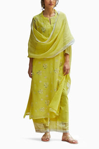 This Handwoven Chanderi Sunshine Yellow Comfort-Fit Set radiates warmth and elegance. The kurta and trouser hemline are beautifully adorned with mallipoo hand block prints, adding a traditional touch to the vibrant yellow base. Paired with a Handwoven chanderi color-block half-width stole, this set perfectly blends classic craftsmanship with contemporary flair, making it an ideal choice for festive occasions or casual outings.